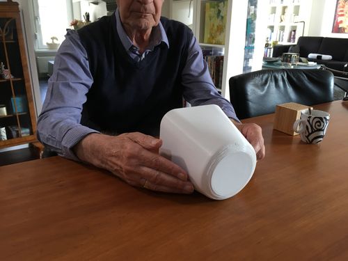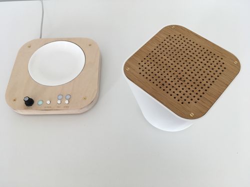 The Tumbler was designed as a minimal and straightforward interface to empower people with dementia to explore meaningful audio content at home. People with dementia can play interactive soundscapes by tilting, rolling, or shaking the portable speaker. When the speaker is tilted upwards, it plays soothing and relaxing background soundscapes. When the user tilts or tumbles the Tumbler, it plays a short playful sound fragment to provide stimulation or activation. Shaking the device will trigger a voice-narrated anecdote related to a meaningful memory of the person with dementia to trigger reminiscence or conversations.